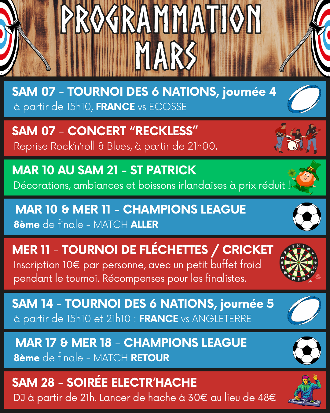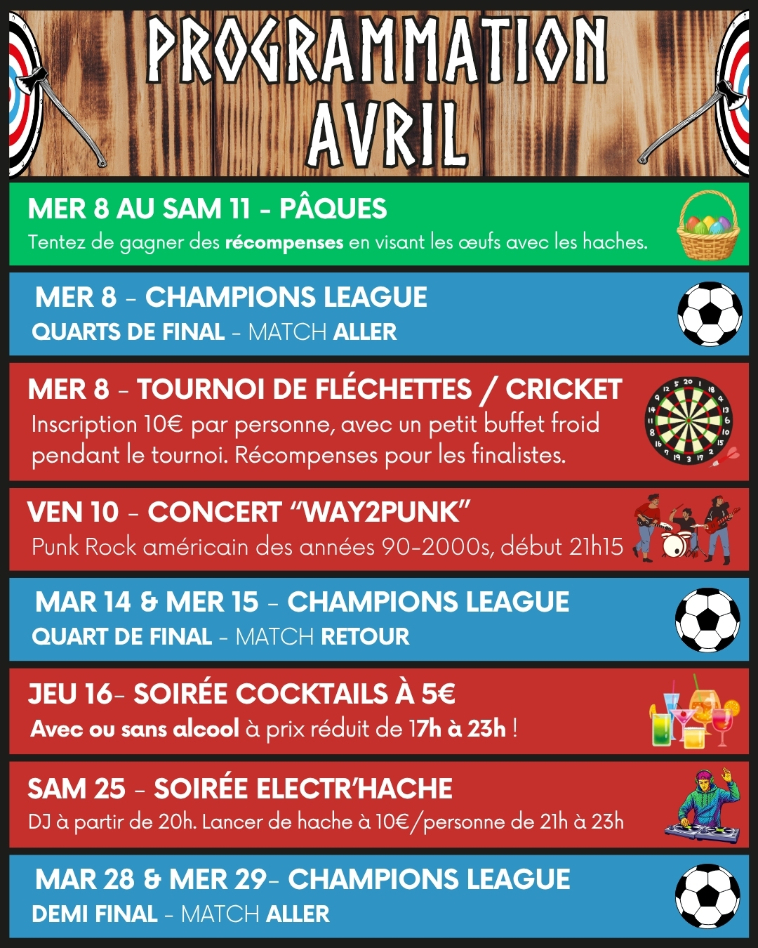 Un concert et une soirée DJ live ainsi qu'un tournoi de fléchettes par mois.